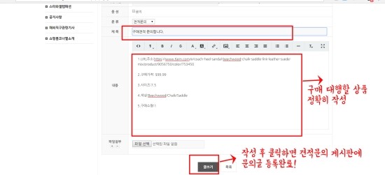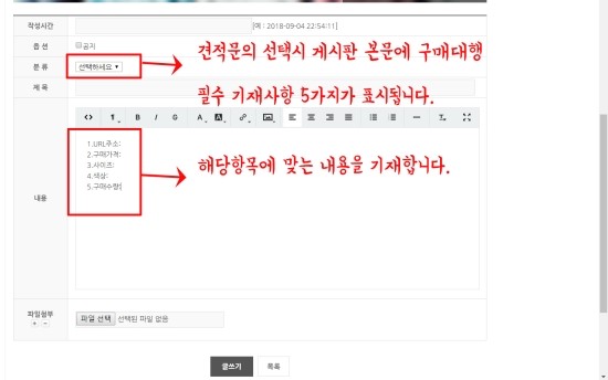 5. 분류에서 견적문의로 선택하면 본문에 구매대행의뢰 시