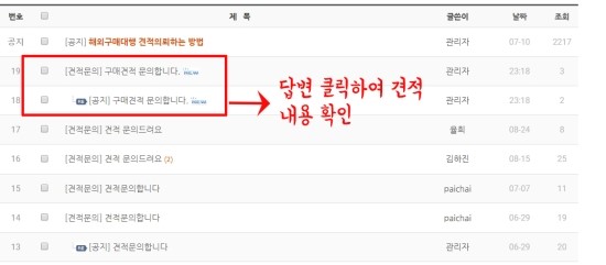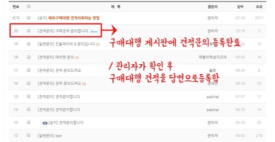 7. 작성한 견적문의 내용이 구매대행게시판 리스트에 표시가 되며